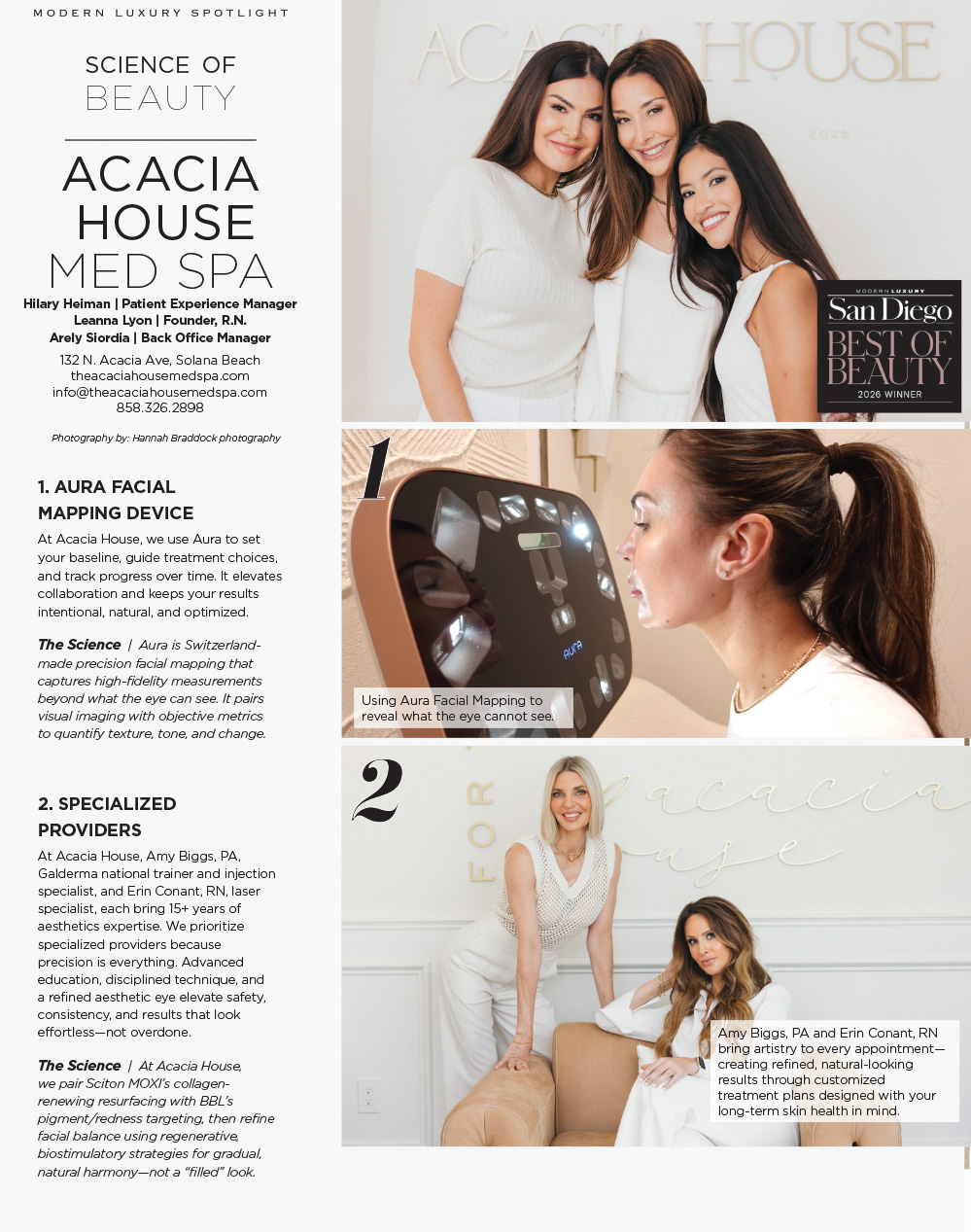 The Acacia House Med Spa was honored to be recognized with the Modern Luxury San Diego Best of Beauty Award in 2026. This distinction highlights their commitment to delivering exceptional, science-based aesthetic care and innovative treatments to clients throughout the San Diego community.